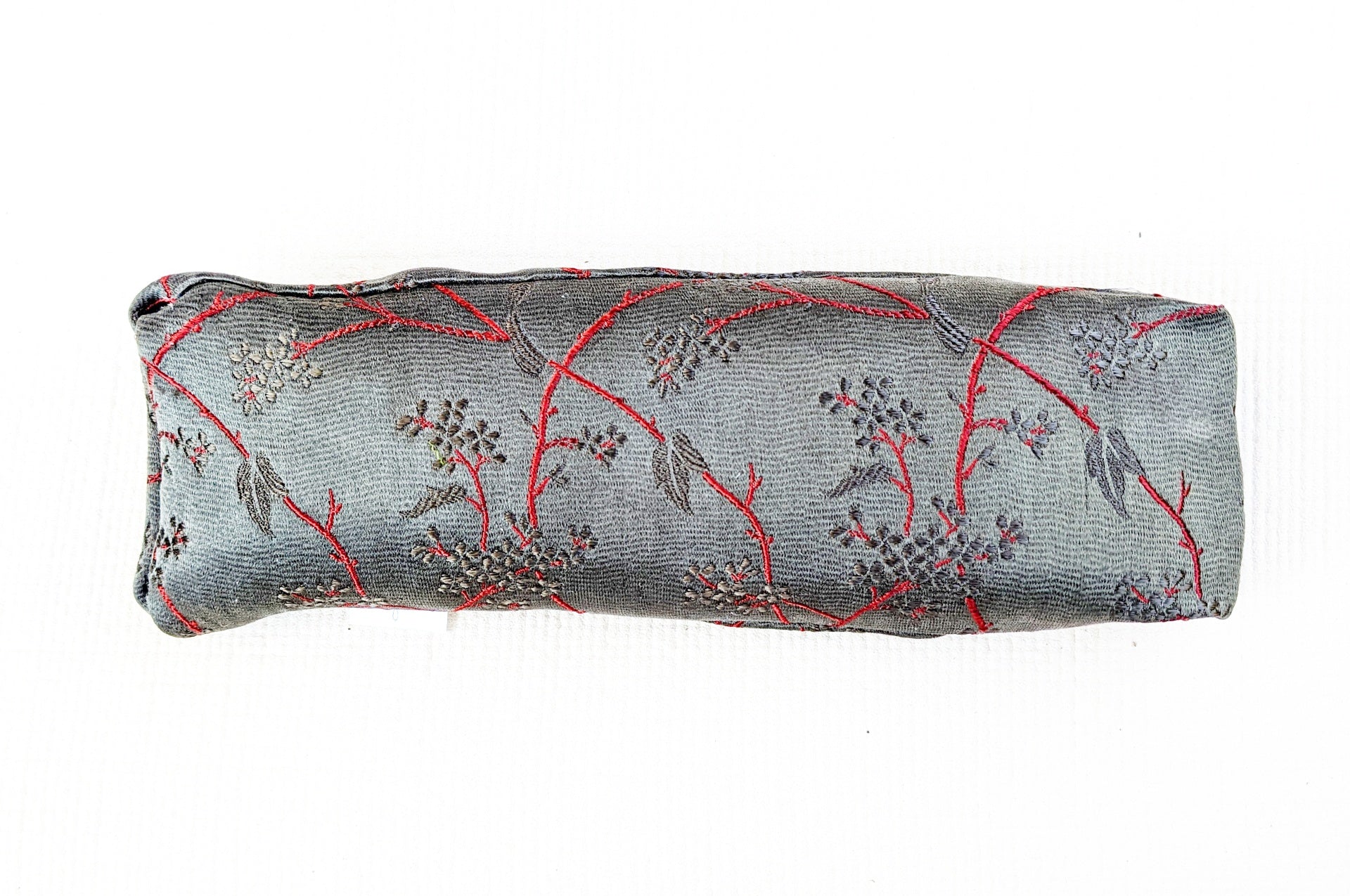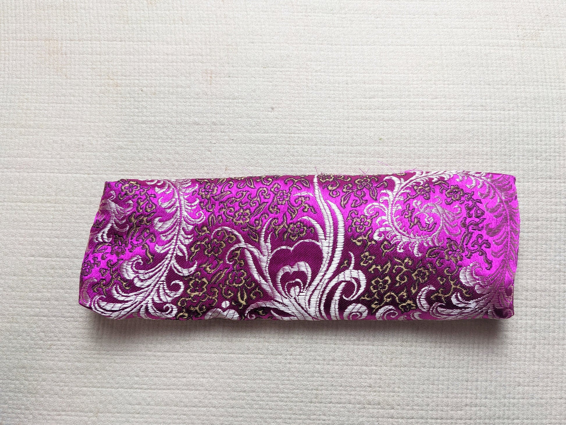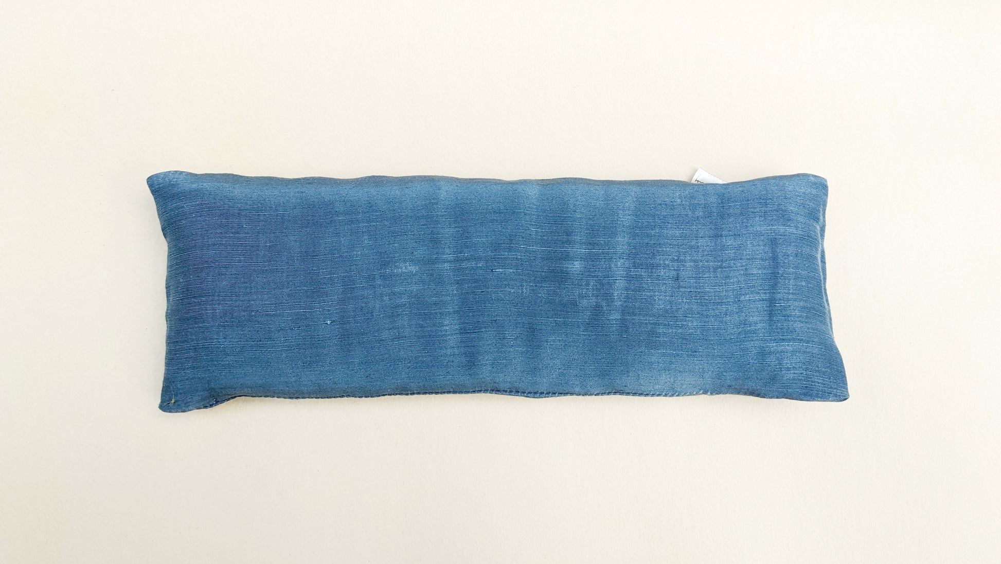 It has an inner silk charmeuse pillow filled with organic flax seed. This batch has a beautiful light gold color silk for the inner bolster pictured with a dark grey background.