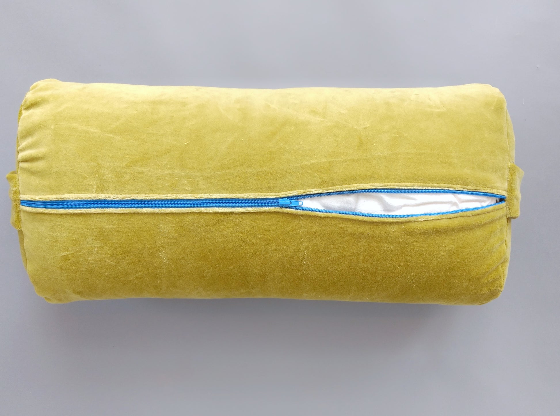This beautiful rich olive velvet is abundant in color and feel. It has been washed and dried. The pile is deliciously rich and thick. This bolster has a sky blue zipper.