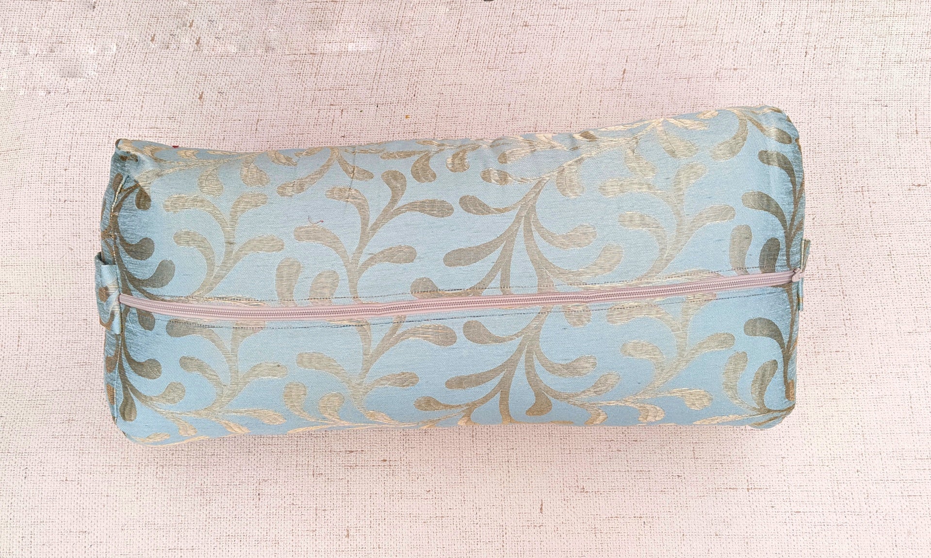 This bolster has a cotton poly blend fabric cover in ice blue with metallic threads of soft gold woven in a fern pattern. The zipper color is beige