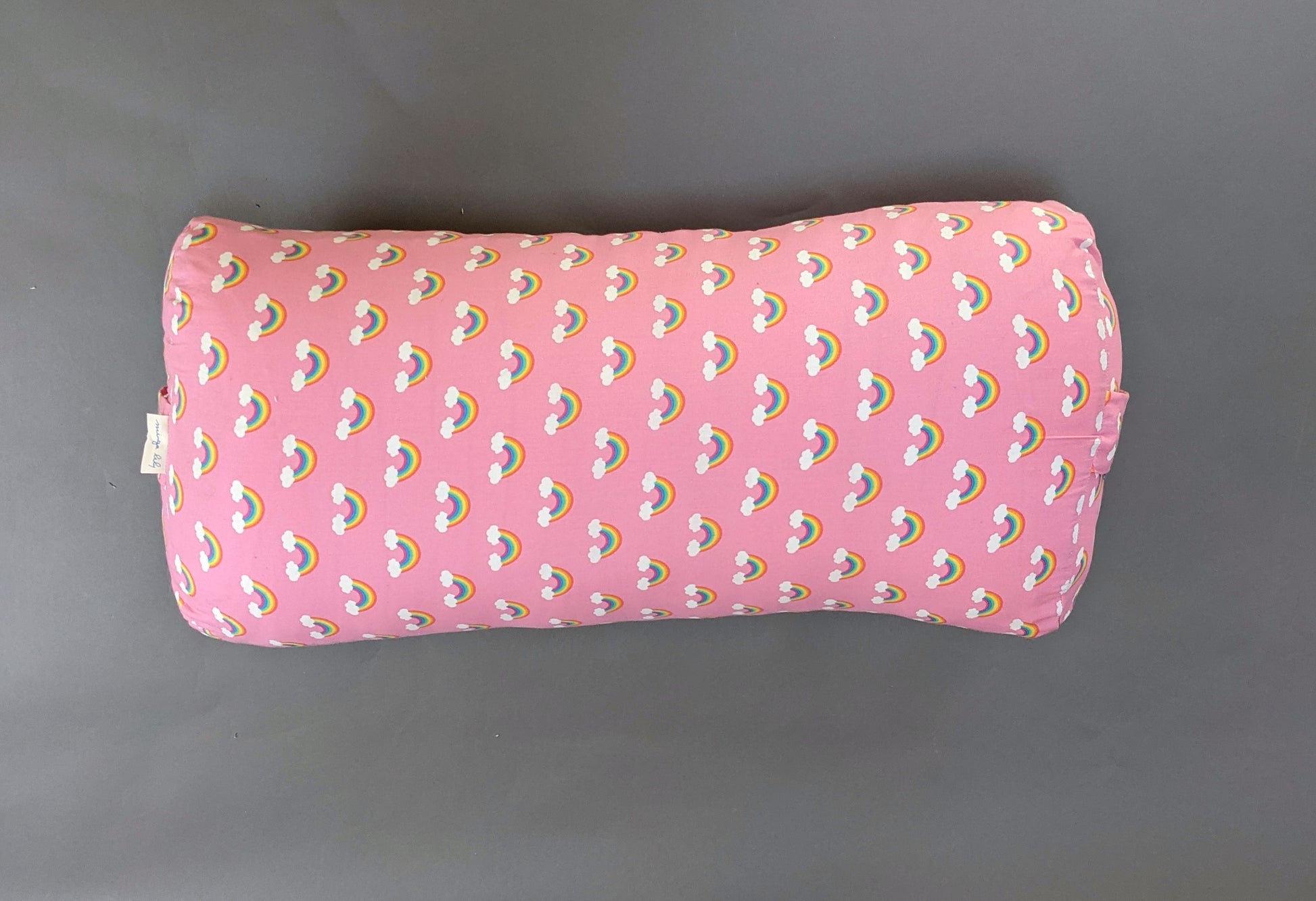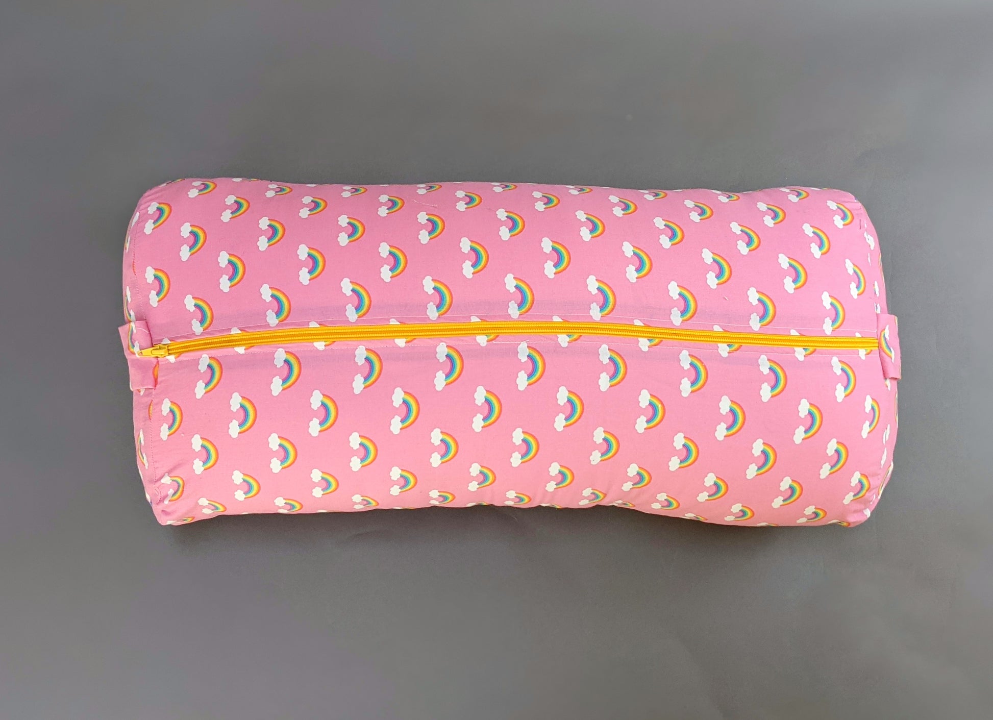 This 100% cotton bolster cover is rainbows on clouds on a pink background. The fabric is smooth. The zipper is bright yellow.